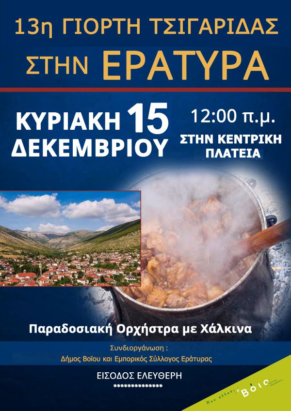 Σας προσκαλούμε στην 13η ΓΙΟΡΤΗ ΤΣΙΓΑΡΙΔΑΣ στην ΕΡΑΤΥΡΑ. Μία εκδήλωση με πολύ κέφι, χορό με δημοτική ορχήστρα. Καλό κρασί και άφθονες τσιγαρίδες, Περιμένουμε τον κόσμο να έρθει να γλεντήσει μαζί μας στην καθιερωμένη, γιορτή Τσιγαρίδας,   στην Κεντρική Πλατεία μας.