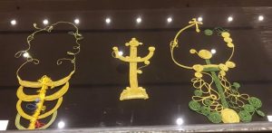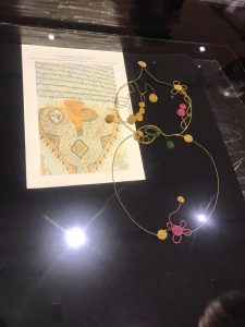 Η αρχαία σπείρα της Ελενης, το πιο συνηθισμένο μοτίβο της χρυσοκλωστης της , κυριαρχεί παντού σε ολες τις προθήκες. Αλλού μικρή σαν της μελισσας τα διαφανή φτερά κι αλλού μεγαλη σαν του κυπαρισσιού τις φούντες! Αλλού μπλέκει και συναγωνίζεται σε ομορφιά τις τουρκικές περγαμηνές της Βιβλιοθηκης κι αλλού στολίζει γιλέκα πλουμιστά και ζώνες χρυσοκεντημένες με βυζαντινη βελονια !