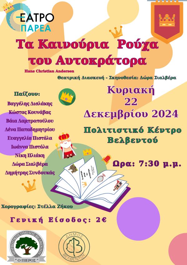 Η θεατρική παράσταση “Τα καινούρια ρούχα του αυτοκράτορα” του Hans Christian Andersen, σε σκηνοθεσία & θεατρική διασκευή της Δώρας Σιαλβέρα, ‘ανεβαίνει’ στο Πολιτιστικό Κέντρο Βελβεντού.