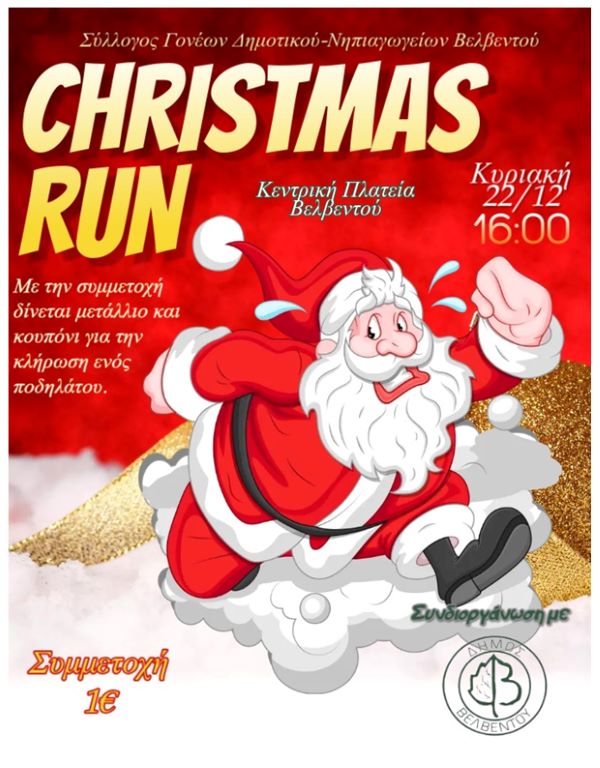 Ο Σύλλογος Γονέων Δημοτικού Νηπιαγωγείου Βελβεντού διοργανώνει Χριστουγεννιάτικο αγώνα τρεξίματος στην κεντρική πλατεία Βελβεντού την Κυριακή 22 Δεκεμβρίου.
