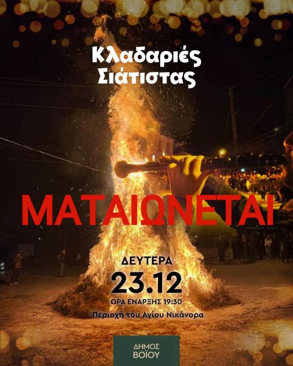 Βόιο 23/12/2024 Αναβάλλεται η αναβίωση του εθίμου ‘Κλαδαριές’ στη Σιάτιστα – Νέα ημερομηνία 0 Ανακοινώνουμε ότι η καθιερωμένη πορεία απο κλαδαριά σε κλαδαριά με τη συνοδεία μουσικής,δεν θα πραγματοποιηθεί λόγω των καιρικών συνθηκών. Το άναμμα των κλαδαριών θα γίνει στις 30 Δεκεμβρίου με το έθιμο των Σούρουβων.