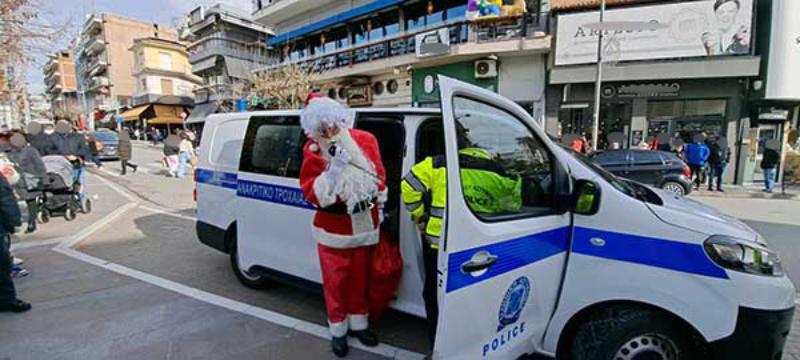 Συγκεκριμένα, οι αστυνομικοί παρουσία του Άγιου Βασίλη διένειμαν έντυπο ενημερωτικό φυλλάδιο με χρηστικές οδηγίες οδικής ασφάλειας και κυκλοφοριακής συμπεριφοράς, δίνοντας ταυτόχρονα συμβουλές και ευχές σε οδηγούς και πεζούς, καθώς και γλυκίσματα στους διερχόμενους πολίτες.