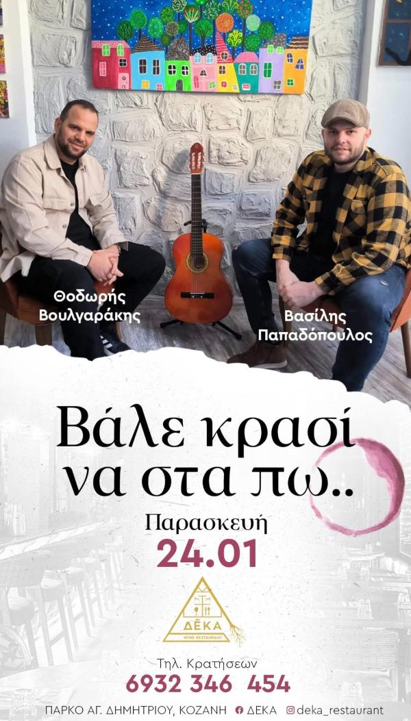 Μια ακόμη μοναδική μουσική βραδιά “έρχεται” στο ΔΕΚΑ wine bar restaurant, την Παρασκευή 24 Ιανουαρίου, με τίτλο ‘Βάλε κρασί να στα πω…’