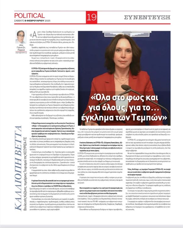 Συνέντευξη Καλλιόπης Βέττα στον Σπ. Παργινό-Εφημερίδα Political, 8/2/2025-«Όλα στο φως και για όλους, για το έγκλημα των Τεμπών»