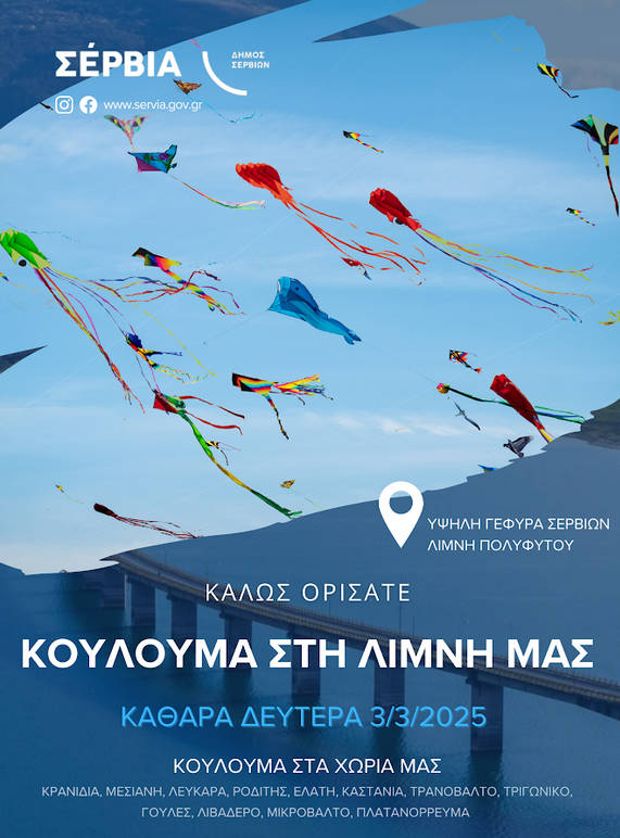 Ο Δήμος Σερβίων προσκαλεί όλους τους δημότες και επισκέπτες να γιορτάσουν μαζί την Καθαρά Δευτέρα στην Υψηλή Γέφυρα Σερβίων, σε μια μεγάλη γιορτή με παραδοσιακά εδέσματα, ζωντανή μουσική και πέταγμα χαρταετού. Στην εκδήλωση θα συμμετέχουν όλοι οι πολιτιστικοί και μορφωτικοί σύλλογοι του Δήμου, προσφέροντας ένα ξεχωριστό εορταστικό πρόγραμμα γεμάτο παράδοση και κέφι.