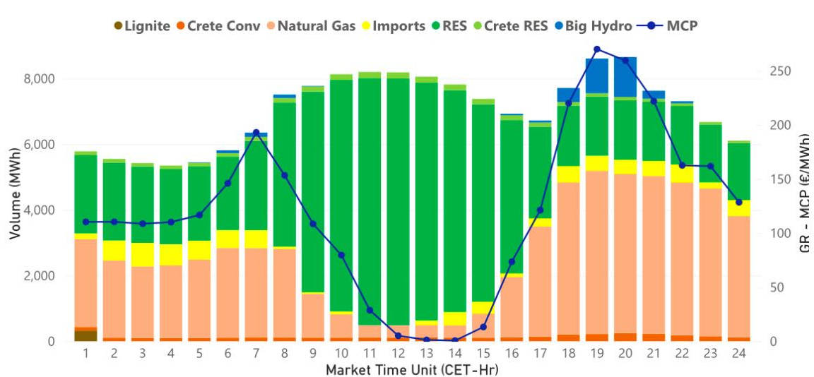 Όπως βλέπετε, κατά τις μεσημεριανές ώρες η τιμή αγγίζει το 0. Αυτές είναι οι ώρες με τη μεγαλύτερη ηλιοφάνεια, και οι τιμές φτάνουν σε αυτά τα επίπεδα λόγω της τεράστιας προσφοράς ενέργειας από φωτοβολταϊκά. Αντίθετα, τις ώρες με μικρότερη ηλιοφάνεια η τιμή ανεβαίνει και φτάνει στα υψηλότερα επίπεδά της στις 19:00 και 20:00, όπου η ζήτηση ενέργειας παραμένει υψηλή, ενώ η προσφορά των φθηνών ΑΠΕ είναι μικρή. Ως αποτέλεσμα, καταφεύγουμε στην παραγωγή ενέργειας από το “ακριβό” φυσικό αέριο, και έτσι η τιμή διαμορφώνεται στα 250€/MWh.