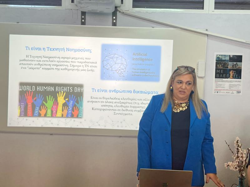Η κ. Φαρμάκη μίλησε στους παρευρισκόμενους για το AI σε σχέση με τα Ανθρώπινα Δικαιώματα ,τις ευκαιρίες και τους κινδύνους που συνεπάγεται η χρήση του, καθώς και τα μέτρα που πρέπει να ληφθούν έτσι ώστε να είναι ασφαλές.
