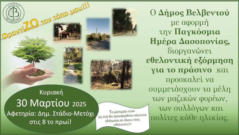 Σέρβια - Βελβεντό 26/03/2025 Δήμος Βελβεντού: Εθελοντική εξόρμηση για την Παγκόσμια Ημέρα Δασοπονίας 0 Εθελοντική εξόρμηση για την Παγκόσμια Ημέρα Δασοπονίας την Κυριακή 30 Μαρτίου