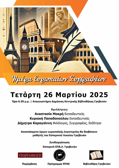 Στο πλαίσιο του προγράμματος σχολεία Πρέσβεις της Ευρωπαϊκής Ένωσης το Εσπερινό Επαγγελματικό Λύκειο Γρεβενών συνδιοργανώνει με την Παρέμβαση και τη Δημοτική Βιβλιοθήκη Γρεβενών εκδήλωση για την ημέρα των Ευρωπαίων συγγραφέων. Στην εκδήλωση θα μιλήσουν οι εκπαιδευτικοί Κυριακή Παπαδοπούλου και Αναστασία Μακρή, καθώς και η συγγραφέας- εκδότρια της Παρέμβασης Δήμητρα Καραγιάννη.