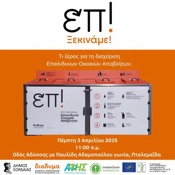 Πτολεμαΐδα 26/03/2025 Ενημερωτική εκδήλωση για τον κάδο ΕΟΑ στον Δήμο Εορδαίας 0 Ενημερωτική εκδήλωση για τον κάδο ΕΟΑ στον Δήμο Εορδαίας Πέμπτη 3 Απριλίου 2025 Ώρα: 11πμ Οδός Αδύσσης με Παυλίδη Αδαμοπούλου γωνία, Πτολεμαΐδα