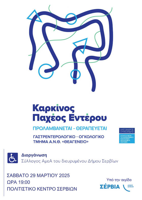 Ο Σύλλογος ΑμεΑ του διευρυμένου Δήμου Σερβίων, σε συνεργασία με το Γαστρεντερολογικό – Ογκολογικό Τμήμα του Α.Ν.Θ. Θεαγένειο και τον Σύλλογο Φίλων Αντικαρκινικού Νοσοκομείου Θεαγένειο «Αλέξανδρος Συμεωνίδης», διοργανώνει ενημερωτική εκδήλωση με θέμα: