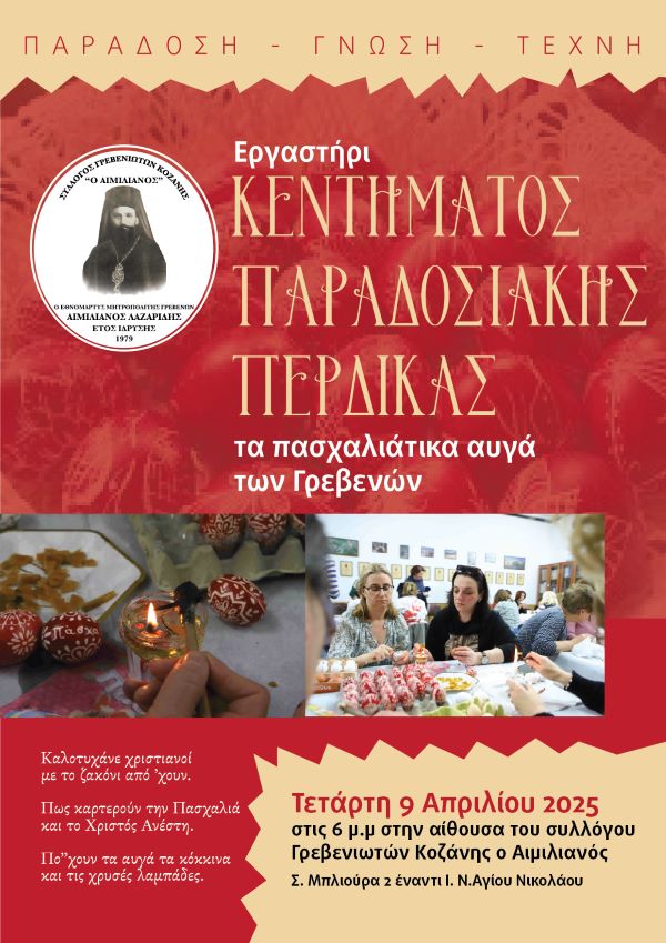 Στα πλαίσια των Πασχαλιάτικων εκδηλώσεων ο Σύλλογος Γρεβενιωτών Κοζάνης Ο ΑΙΜΙΛΙΑΝΟΣ πραγματοποιεί και φέτος Τετάρτη 9 Απριλίου στις 6:00 μ.μ. στην αίθουσα του χορευτικού του συλλόγου (Σ. Μπλιούρα 2, απέναντι από τον Ιερό Ναό του Αγίου Νικολάου), την καθιερωμένη και πετυχημένη εκδήλωση τα τελευταία χρόνια (από το 2016) της κατασκευής των Πασχαλιάτικων Περδικών.