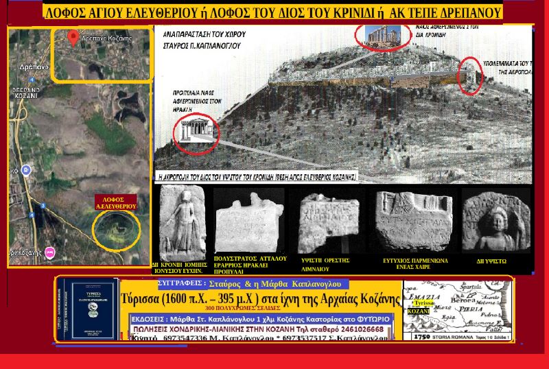 *ΙΙ ΚΡΟΝΙΗ ΙΟΜΗΗΣ ΙΟΝΥΣΙΟΥ ΕΥΧΗΝ. Στον λόφο του Αγίου Ελευθερίου στην Κοζάνη βρίσκονται αρχαιολογικά ευρήματα που χρονολογούνται . Ανάμεσα στα ευρήματα περιλαμβάνονται ερείπια οικοδομημάτων, ένας βωμός, τμήμα υδραγωγείου, αγάλματα, νομίσματα, τάφοι και βάσεις κιόνων.