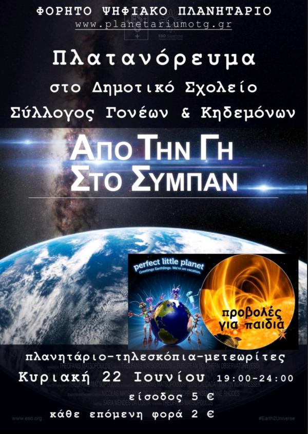 Την Κυριακή 22 Ιουνίου, το Δημοτικό Σχολείο Πλατανορεύματος μεταμορφώνεται σε ένα παράθυρο προς το Σύμπαν, με τη φιλοξενία ενός εντυπωσιακού φορητού ψηφιακού πλανηταρίου.
