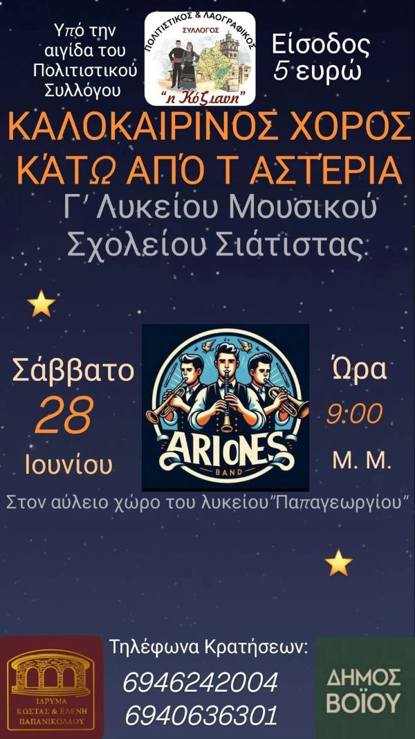 Βόιο 26/06/2025 Καλοκαιρινός χορός κάτω απο τ’ αστέρια Γ’ Λυκείου Μουσικού Σχολείου Σιάτιστας 0 Καλοκαιρινός χορός κάτω απο τ’ αστέρια Γ’ Λυκείου Μουσικού Σχολείου Σιάτιστας Σάββατο 28 Ιουνίου 2025 στις 21:00 Στον αύλειο χώρο Γυμνασίου- Λυκείου «Γ. Παπαγεωργίου» Τηλέφωνα κρατήσεων: 6946242004 και 6940636301