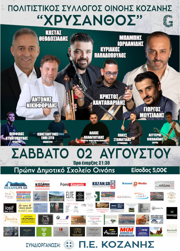Ο Πολιτιστικός Σύλλογος Οινόης Κοζάνης «ΧΡΥΣΑΝΘΟΣ» σας προσκαλεί στην καθιερωμένη πανηγυρική του εκδήλωση, το Σάββατο 2 Αυγούστου 2025, στον προαύλιο χώρο του πρώην Δημοτικού Σχολείου Οινόης.