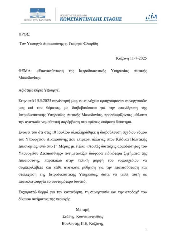 Όπως είχε δεσμευτεί ο Υπουργός Δικαιοσύνης Γιώργος Φλωρίδης, συμπεριλήφθηκε στο άρθρο 163 του νέου ν/σ του Υπουργείου Δικαιοσύνης η ρύθμιση για την επανασύσταση και λειτουργία της Ιατροδικαστικής Υπηρεσίας Δυτικής Μακεδονίας στην Κοζάνη, για τη στελέχωση της οποίας προβλέπεται η σύσταση οκτώ οργανικών θέσεων ως εξής: δύο θέσεων Ιατροδικαστών, δύο θέσεων ΥΕ Νεκροτόμων, δύο θέσεων του κλάδου ΤΕ Λογιστικού-Διοικητικού και δύο θέσεων ΤΕ Υγείας Πρόνοιας ειδικότητας Νοσηλευτικής.