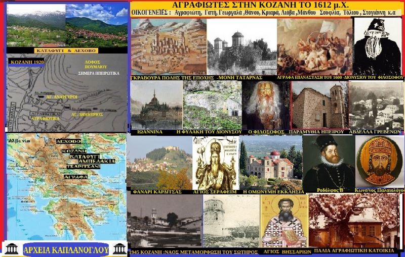 ΠΡΟΓΟΝΙΚΕΣ ΕΣΤΙΕΣ ΚΟΖΑΝΙΤΩΝ (16ον)Α) ΑΓΡΑΦΙΩΤΕΣ ΣΤΗΝ ΚΟΖΑΝΗ ΤΟ 1612 1. Ποια ήταν η αιτία που τους εξώθησε σε ομαδική φυγή από τον τόπο τους2. Μερικά ονόματα οικογενειών : Αγραφιώτη, Γατή, Γεωργαλά ,Θάνου, Κριαρά, Λιόβα ,Μάνθου Σουφλία, Τόλιου και η οικογένεια Στογιάννη .3. Τι τους συνδέει με τους κατοίκους του Καταφυγίου Κοζάνης και του Λεχόβου της ΦλώριναςΣταύρου Π. Καπλάνογλου Συγγραφέα -Ιστορικού ερευνητή