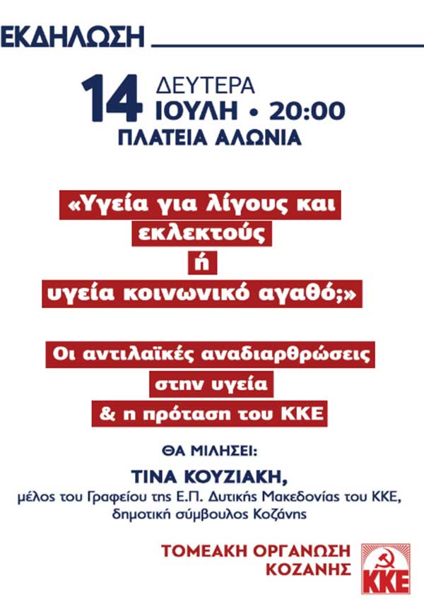 Η Τομεακή Οργάνωση Κοζάνης του ΚΚΕ θα πραγματοποιήσει εκδήλωση με θέμα: «Υγεία για λίγους και εκλεκτούς ή υγεία κοινωνικό αγαθό; Οι αντιλαϊκές αναδιαρθρώσεις στην υγεία & η πρόταση του ΚΚΕ».