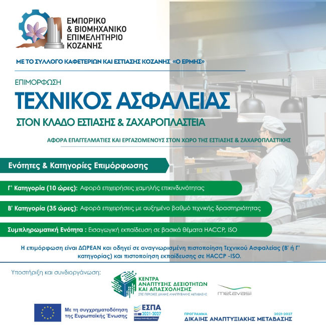 Σημαντική ευκαιρία εκπαίδευσης και ενίσχυσης επαγγελματικών προσόντων προσφέρει το Επιμελητήριο Κοζάνης σε συνεργασία με τον Σύλλογο Καφετεριών και Εστίασης Κοζάνης «Ο Ερμής». Μέσα από τρία εξειδικευμένα προγράμματα επιμόρφωσης, εργοδότες, εργαζόμενοι και επαγγελματίες του κλάδου εστίασης έχουν τη δυνατότητα να αποκτήσουν επίσημη και αναγνωρισμένη πιστοποίηση Τεχνικού Ασφαλείας, χωρίς καμία οικονομική επιβάρυνση.