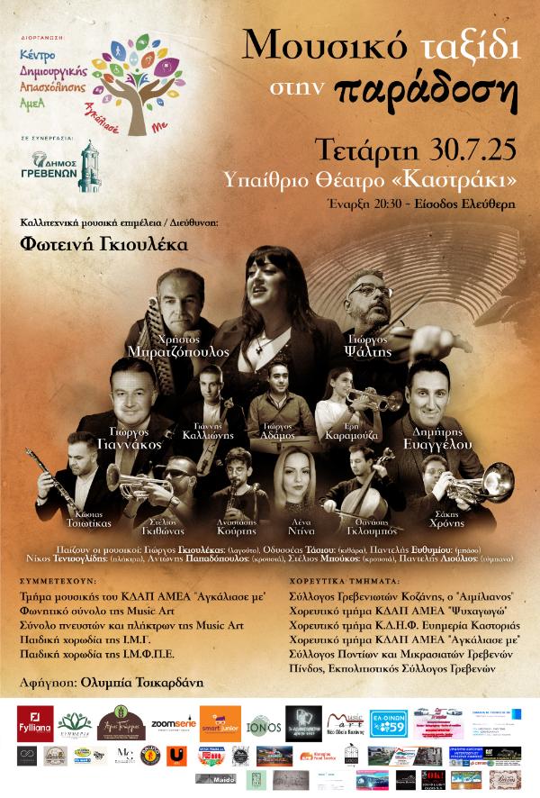 Ο Δήμος Γρεβενών και το ΚΔΑΠ ΑμεΑ «Αγκάλιασέ με» έχουν την τιμή να σας προσκαλέσουν σε μια ξεχωριστή μουσική εκδήλωση με τίτλο «Μουσικό Ταξίδι στην Παράδοση», που θα πραγματοποιηθεί την Τετάρτη 30 Ιουλίου 2025, στις 20:30, στο Υπαίθριο Θέατρο «Καστράκι» στα Γρεβενά.