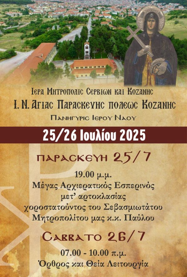 Το Σάββατο 26 Ιουλίου 2025, εορτή της Αγίας οσιομάρτυρος Παρασκευής, πανηγυρίζει ο ομώνυμος Ιερός Ενοριακός Ναός στην πόλη της Κοζάνης, όπου