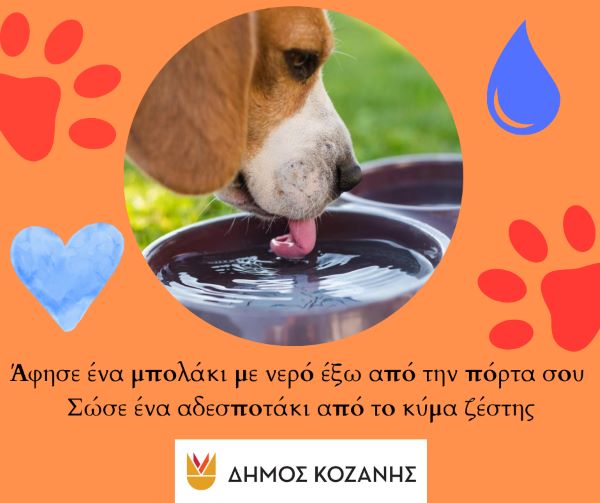 Ο Δήμος Κοζάνης απευθύνει έκκληση σε όσους δημότες μπορούν και επιθυμούν, να αφήσουν ένα μπολάκι με φρέσκο δροσερό νερό έξω από την οικία τους ή το κατάστημά τους για τα αδέσποτα ζώα συντροφιάς καθώς αυτές τις ημέρες σημειώνονται και στην περιοχή μας, πολύ υψηλές θερμοκρασίες.