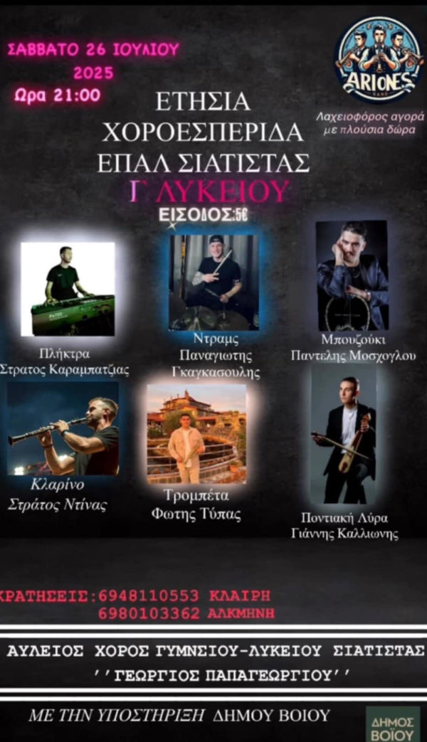 Βόιο 24/07/2025 Το Σάββατο 26 Ιουλίου ο ετήσιος καλοκαιρινός χορός του ΕΠΑΛ Σιάτιστας 0 Το Σάββατο 26 Ιουλίου ο ετήσιος καλοκαιρινός χορός του ΕΠΑΛ Σιάτιστας