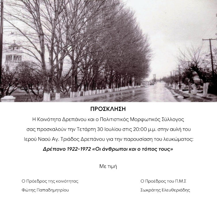 Κοζάνη 26/07/2025 Παρουσίαση του λευκώματος: Δρέπανο 1922–1972 «Οι άνθρωποι και ο τόπος τους» 0 Η Κοινότητα Δρεπάνου και ο Πολιτιστικός Μορφωτικός Σύλλογος σας προσκαλούν την Τετάρτη 30 Ιουλίου στις 20:00 μ.μ. στην αυλή του Ιερού Ναού Αγ. Τριάδος Δρεπάνου για την παρουσίαση του λευκώματος: Δρέπανο 1922–1972 «Οι άνθρωποι και ο τόπος τους»