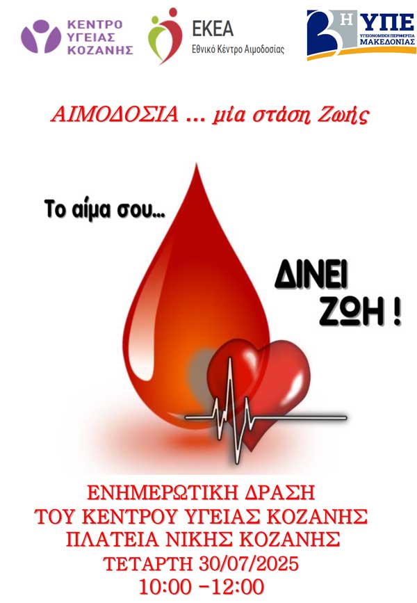 Το Κέντρο Υγείας Κοζάνης θα πραγματοποιήσει ενημερωτική δράση την Τετάρτη 30 Ιουλίου και ώρα 10.00-12.00 στην κεντρική πλατεία της πόλης με θέμα: “ΑΙΜΟΔΟΣΙΑ … μία στάση Ζωής”.Κατά τη διάρκεια του καλοκαιριού, και ιδιαίτερα τον Αύγουστο, οι ανάγκες για αίμα αυξάνονται, ενώ ταυτόχρονα μειώνονται οι εθελοντές αιμοδότες λόγω διακοπών.