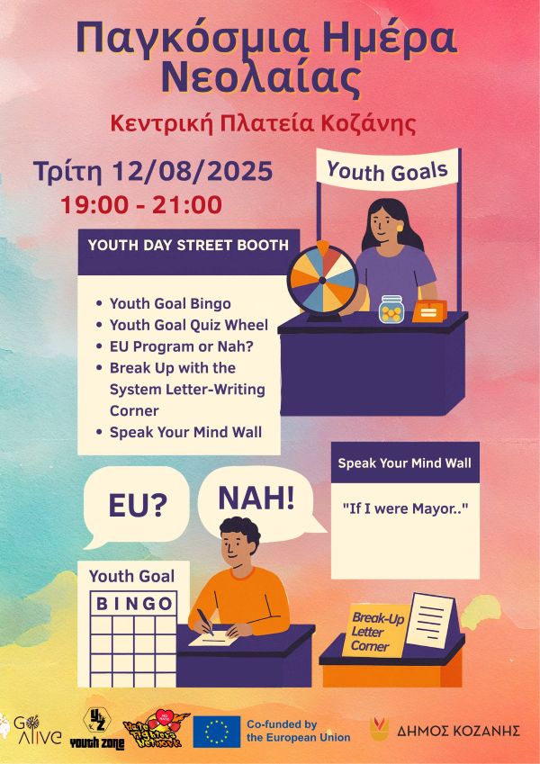 Αύριο, στις 12 Αυγούστου, γιορτάζουμε την Παγκόσμια Ημέρα Νεολαίας – μια παγκόσμια εκδήλωση αφιερωμένη στην αναγνώριση της συμβολής και του δυναμικού των νέων σε ολόκληρο τον κόσμο. Ο φετινός εορτασμός στην Κοζάνη από τον οργανισμό νεολαίας GO Alive και το Δήμο Κοζάνης αποτελεί μια ξεχωριστή ευκαιρία για την τοπική μας κοινότητα να ενωθεί, να αναδείξει τη σημασία της συμμετοχής των νέων και να προβάλλει τη δημιουργική τους ενέργεια.