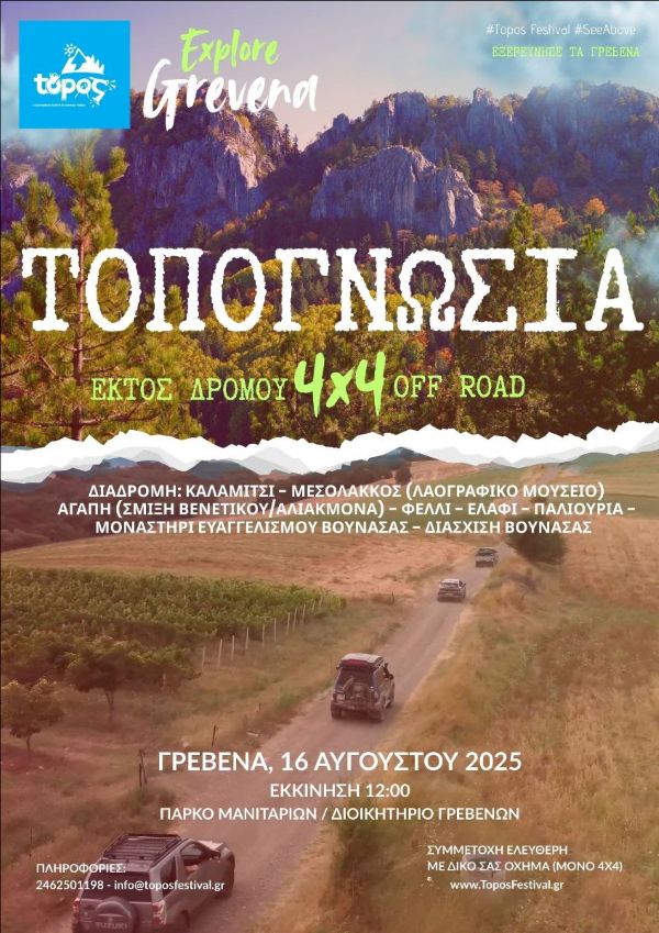 Η συμμετοχή γίνεται με δικό σας όχημα. Πρέπει να είναι 4Χ4 καθώς η διαδρομή περιλαμβάνει διάσχιση ποταμών και απαιτητικών περασμάτων. (Πληροφοριές 2462501198 – info@toposfestival.gr
