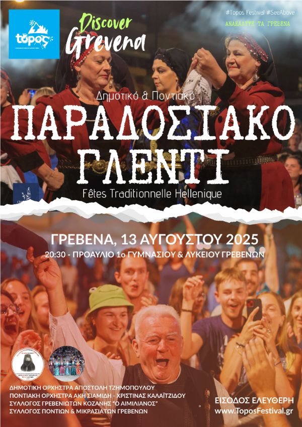 Παραδοσιακό Γλέντι (Δημοτικό & Ποντιακό) με τους εξαίρετους Συλλόγους που διαρκώς μας κάνουνε υπερήφανους σε διεθνές επίπεδο, τον Σύλλογο Γρεβενιωτών Κοζάνης “Αιμιλιανός” και τον Σύλλογο Ποντίων και Μικρασιατών Γρεβενών, θα τους πλαισιώσει η Παραδοσιακή Ορχήστρα του Απόστολου Τζημόπουλου και η Ορχήστρα του Άκη Σιαμίδη και της Χριστίνας Καλαϊτζίδου.