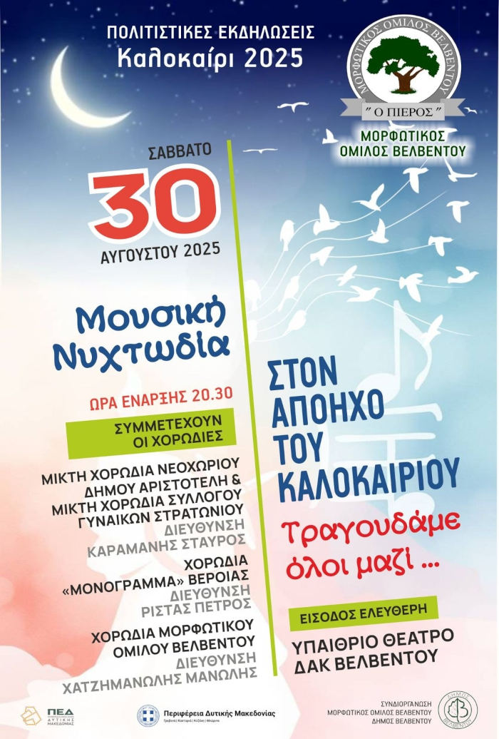 Σέρβια - Βελβεντό 28/08/2025 Εκδήλωση του Μορφωτικού Ομίλου Βελβεντού “Μουσική Νυχτωδία” 0 Εκδήλωση του Μορφωτικού Ομίλου Βελβεντού “Μουσική Νυχτωδία”