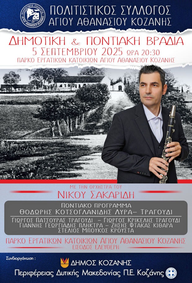 Μια βραδιά γεμάτη παραδοσιακούς ήχους και χορούς ετοιμάζεται να ζωντανέψει το πάρκο των Εργατικών Κατοικιών του Αγίου Αθανασίου. Ο τοπικός σύλλογος διοργανώνει παραδοσιακή δημοτική και ποντιακή βραδιά, προσκαλώντας όλους τους κατοίκους της περιοχής σε μια εκδήλωση που υπόσχεται να συνδυάσει την πολιτιστική παράδοση με την κοινωνική συναναστροφή.