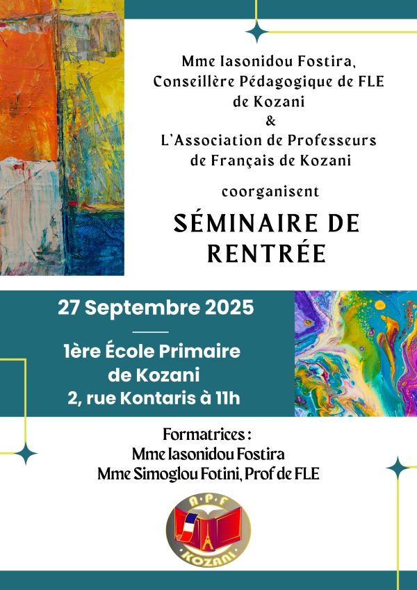 Η κυρία Ιασονίδου Φωστήρα, Σύμβουλος Εκπαίδευσης Γαλλικής Γλώσσας Π.Ε. Κοζάνης και ο Σύλλογος Καθηγητών Γαλλικής Γλώσσας Ν. Κοζάνης συνδιοργανώνουν επιμορφωτικό σεμινάριο για όλους τους καθηγητές και τις καθηγήτριες που διδάσκουν την γαλλική γλώσσα στο δημόσιο και τον ιδιωτικό τομέα.