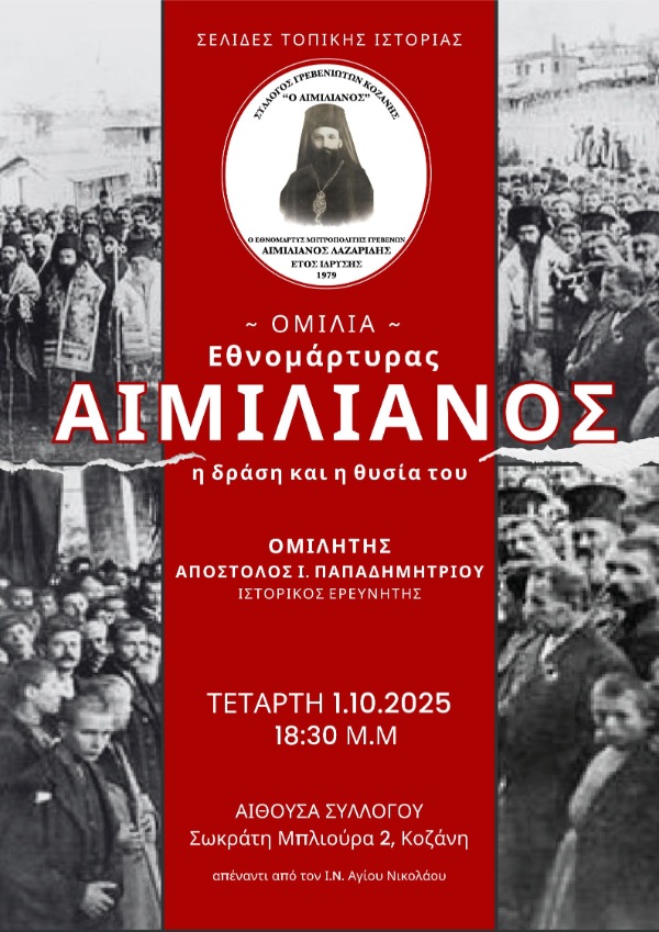 Ο Σύλλογος Γρεβενιωτών Κοζάνης Ο ΑΙΜΙΛΙΑΝΟΣ διοργανώνει την Τετάρτη 1 Οκτωβρίου και ώρα 18:30 στην αίθουσα του χορευτικού του συλλόγου (Σωκράτη Μπλιούρα 2, απέναντι από τον Ιερό Ναό του Αγίου Νικολάου) αφιέρωμα στον Εθνομάρτυρα Μητροπολίτη Γρεβενών Αιμιλιανό Λαζαρίδη(η δράση και η θυσία του) με κεντρικό ομιλητή τον Ιστορικό Ερευνητή και Συγγραφέα κύριο Παπαδημητρίου Απόστολο.