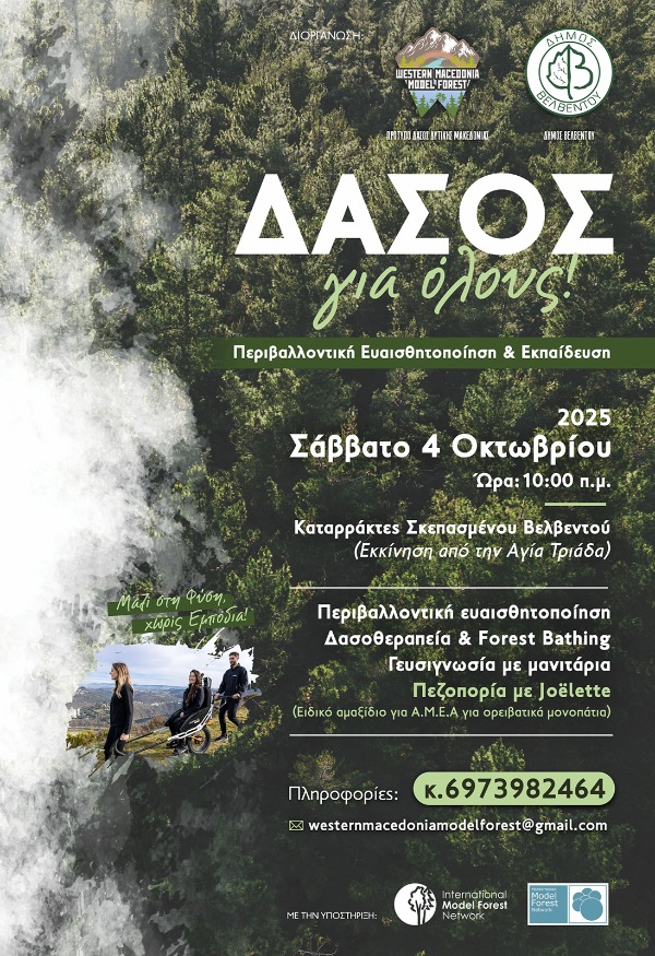 Το Πρότυπο Δάσος Δυτικής Μακεδονίας, σε συνεργασία με τον Δήμο Βελβεντού και με την υποστήριξη του Διεθνούς και Μεσογειακού Δικτύου Πρότυπων Δασών, διοργανώνει το Σάββατο 04 Οκτωβρίου 2025 τη δράση: «Δάσος για Όλους: Εκδρομή Ευαισθητοποίησης, Ενημέρωσης και Δασοθεραπείας», στην περιοχή Σκεπασμένο του Δήμου Βελβεντού.