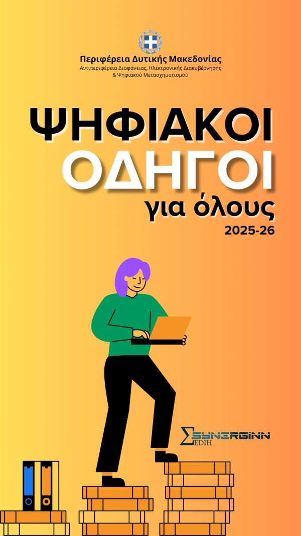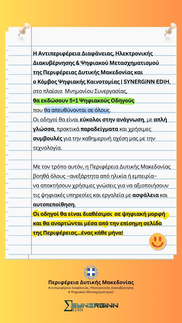 Η Αντιπεριφέρεια Διαφάνειας, Ηλεκτρονικής Διακυβέρνησης & Ψηφιακού Μετασχηματισμού της Περιφέρειας Δυτικής Μακεδονίας και ο Κόμβος Ψηφιακής Καινοτομίας | SYNERGiNN EDIH, στο πλαίσιο Μνημονίου Συνεργασίας, θα εκδώσουν 5+1 Ψηφιακούς Οδηγούς που θα απευθύνονται σε όλους.Οι οδηγοί θα είναι εύκολοι στην ανάγνωση, με απλή γλώσσα, πρακτικά παραδείγματα και χρήσιμες συμβουλές για την καθημερινή σχέση μας με την τεχνολογία.