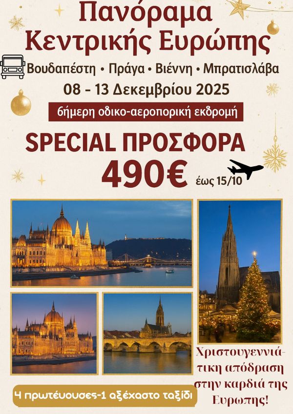 Το ταξιδιωτικό γραφείο HERMES TOURS σας προσκαλεί να ανακαλύψετε την εορταστική μαγεία τεσσάρων παραμυθένιων ευρωπαϊκών πρωτευουσών – Βιέννη, Πράγα, Βουδαπέστη και Μπρατισλάβα – μέσα από ένα προσεκτικά σχεδιασμένο οδικοαεροπορικό πακέτο.