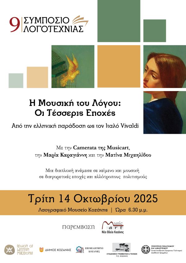 Στο πλαίσιο του 9ου Συμποσίου Λογοτεχνίας στην Κοζάνη, θα πραγματοποιηθεί εκδήλωση σε συνεργασία με το Νέο Ωδείο Music Art, την Τρίτη 14 Οκτωβρίου, στο Λαογραφικό Μουσείο Κοζάνης, στις 6.30 μ.μ., με τίτλο «Η μουσική του λόγου: Οι τέσσερις εποχές – Από την ελληνική παράδοση ως τον Ιταλό Vivaldi». Μια εκδήλωση που μαρτυρά τη διαπλοκή ανάμεσα σε κείμενο και μουσική, σε διαφορετικές εποχές και αλλότροπους πολιτισμούς