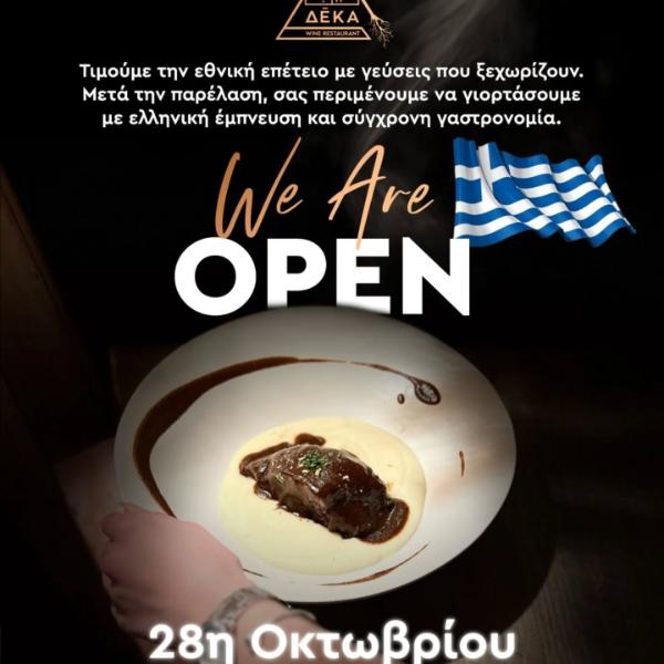 Αμέσως μετά την παρέλαση, το ΔΕΚΑ τιμά την εθνική επέτειο με ένα εορταστικό μενού βασισμένο στην ελληνική παράδοση, εμπλουτισμένο με σύγχρονες γευστικές πινελιές. Μουσική συνοδεία και φιλόξενη ατμόσφαιρα συνθέτουν το ιδανικό σκηνικό για ένα ξεχωριστό μεσημέρι.