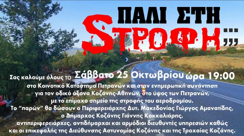 Σας καλούμε όλους το Σάββατο 25 Οκτωβρίου 2025 και ώρα 19:00 στο Κοινοτικό Κατάστημα Πετρανών και στην ενημερωτική συνάντηση για τον οδικό άξονα Κοζάνης-Αθηνών, στο ύψος των Πετρανών, με το επίμαχο σημείο της στροφής του αεροδρομίου.