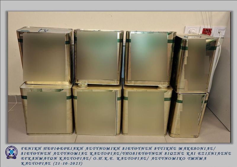 Ειδικότερα, χθες το απόγευμα οι προαναφερόμενοι αστυνομικοί, εντόπισαν στην πόλη της Καστοριάς, Ι.Χ.Ε. αυτοκίνητο με οδηγό τον 66χρονο ημεδαπό και σε αστυνομικό έλεγχο που πραγματοποιήθηκε διαπιστώθηκε, να κατέχει και να διαθέτει προς πώληση -8- δοχεία, τα οποία περιείχαν συνολικά -101- λίτρα λαδιού, αγνώστου προέλευσης και αμφιβόλου ποιότητας που προσομοίαζε σε ελαιόλαδο, χωρίς να διαθέτουν τα νόμιμα παραστατικά έγγραφα αγοράς.
