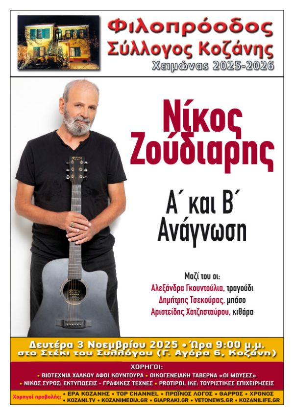 Ο Φιλοπρόοδος Σύλλογος Κοζάνης καθώς περνάμε στη χειμερινή περίοδο, ξεκινά τον νέο κύκλο των μουσικών του εκδηλώσεων, στους ζεστούς και φιλόξενους χώρους του Αρχοντικού μας και σας προσκαλεί να υποδεχτούμε μαζί έναν σπουδαίο, σύγχρονο μουσικό δημιουργό – κόσμημα για το Ελληνικό τραγούδι, τον Νίκο Ζούδιαρη, που έρχεται να ξεδιπλώσει το σύνολο του σημαντικού του ρεπερτορίου σε μια παράσταση με τίτλο «Α’ & Β’ Ανάγνωση».