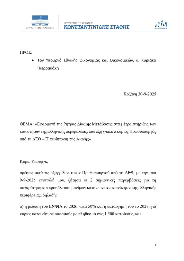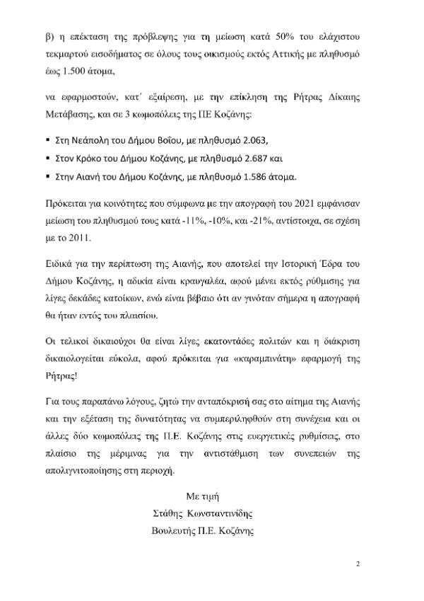 σε οικισμούς με πληθυσμό έως 1.500 κατοίκους, απέστειλα το αίτημα ώστε να συμπεριληφθεί και η Αιανή, με πληθυσμό μόλις 1.586 άτομα, στο πολύ σημαντικό αυτό μέτρο για την ελληνική περιφέρεια.