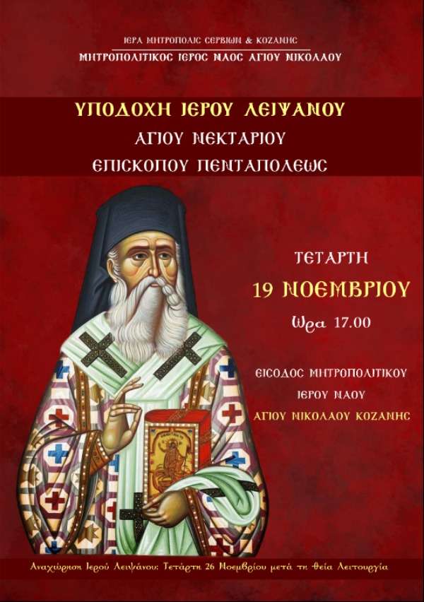 5.00 μ.μ. Ὑποδοχὴ Ἱεροῦ Λειψάνου Ἁγίου Νεκταρίου ἀπὸ τὸν Σεβασμιώτατο Μητροπολίτη Σερβίων & Κοζάνης κ. Παῦλον – Ἑσπερινὸς μετ’ ἀρτοκλασίας – Ἱερὰ Παράκληση στὸν Ἅγιο Νεκτάριο.