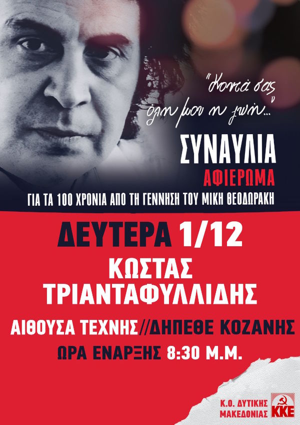 Η Κομματική Οργάνωση Δυτικής Μακεδονίας του ΚΚΕ διοργανώνει μεγάλη συναυλία τη Δευτέρα 1 Δεκέμβρη, στις 8:30 μ.μ., στην Αίθουσα Τέχνης του ΔΗΠΕΘΕ Κοζάνης, αφιερωμένη στα 100 χρόνια από τη γέννηση του σπουδαίου συνθέτη Μίκη Θεοδωράκη, με τίτλο: