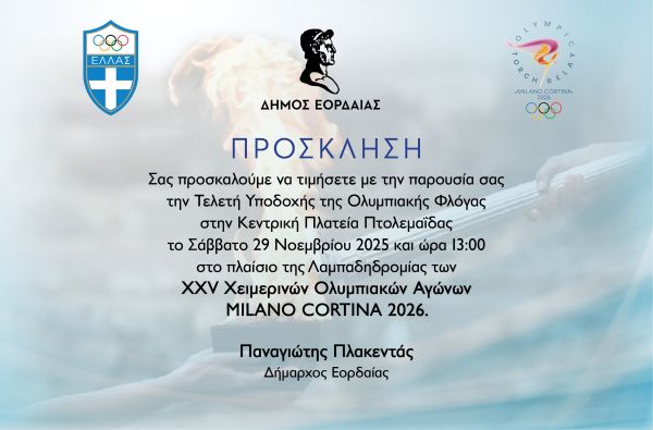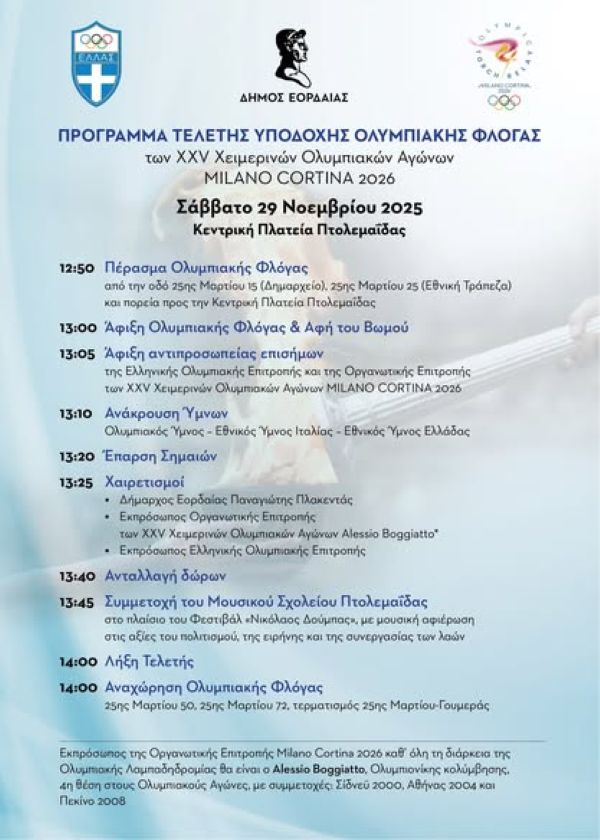 Πτολεμαΐδα 24/11/2025 Η Πτολεμαΐδα υποδέχεται την Ολυμπιακή Φλόγα των Χειμερινών Αγώνων MILANO CORTINA 2026 0 Η Πτολεμαΐδα γίνεται πόλη–σταθμός της Ολυμπιακής Λαμπαδηδρομίας MILANO CORTINA 2026. Κεντρική Πλατεία 29.11.2025 -13:00 Ελάτε να υποδεχτούμε τη Φλόγα!