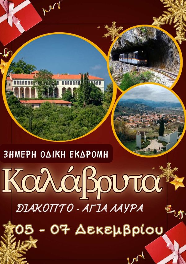 Μπείτε στο κλίμα των Χριστουγέννων με μια μαγική απόδραση στα στολισμένα και χειμωνιάτικα Καλάβρυτα!Απολαύστε τη γιορτινή ατμόσφαιρα, τη γραφική διαδρομή του οδοντωτού στο Διακοπτό και μια ξεχωριστή επίσκεψη στην ιστορική Αγία Λαύρα.